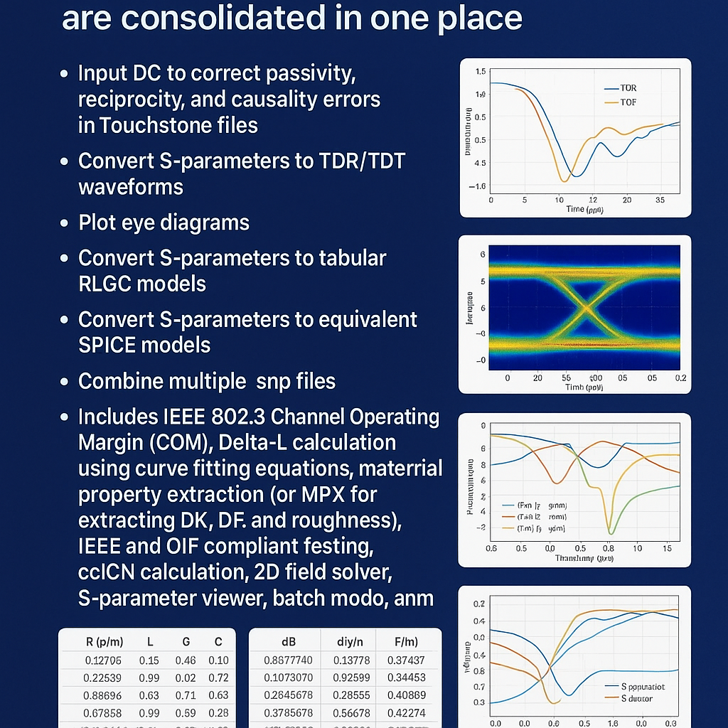 Over 25 types of SI applications are consolidated in one place. Input DC to correct passivity, reciprocity, and causality errors in Touchstone files. Convert S-parameters to TDR/TDT waveforms. Plot eye diagrams. Convert S-parameters to tabular RLGC models. Convert S-parameters to equivalent SPICE models. Combine multiple .snp files. Includes IEEE 802.3 Channel Operating Margin (COM), Delta-L calculation using curve fitting equations, material property extraction (or MPX for extracting DK, DF, and roughness), IEEE and OIF compliant testing, ccICN calculation, 2D field solver, S-parameter viewer, batch mode, and more.